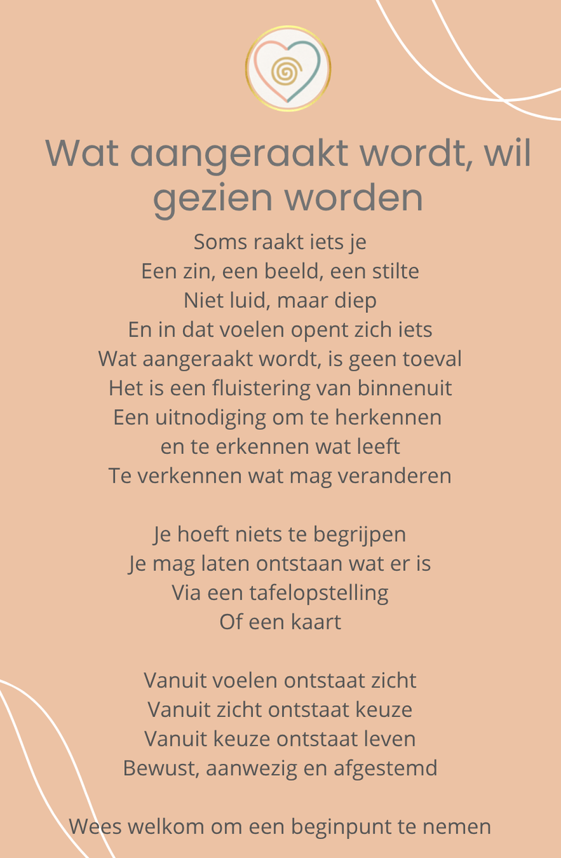Wees uitgenodigd, om te verkennen wat wil gezien worden. Wat je ervaart is een mogelijk beginpunt om jezelf te leren kennen. Verken via andere perspectieven, van tafelopstelling tot kaarten. Een andere manier kan zowaar wegen openen.